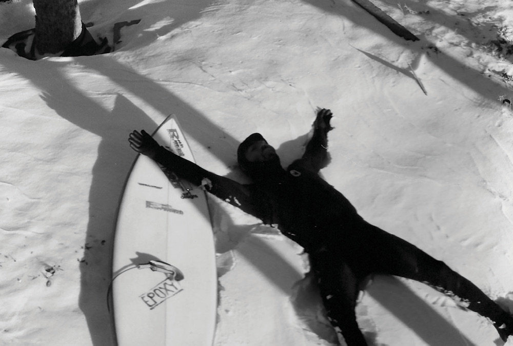 The two-day snowfall in December 1989 wasn’t a complete blessing. Many Folly Beach residents had been without gas service since Hugo (and many collapsed homes remained eerily in place). Pipes froze and burst, leaving some residents with a chilly and frustrating (yet beautiful) white Christmas. “There were no waves,” says Betty Sue Cowsert of the snowy day her husband Bill Perry decided to paddle out in December 1989. Here, Perry makes a rare snow angel in coastal South Carolina, Folly Beach style. (Courtesy of Bill Perry and Betty Sue Cowsert.)